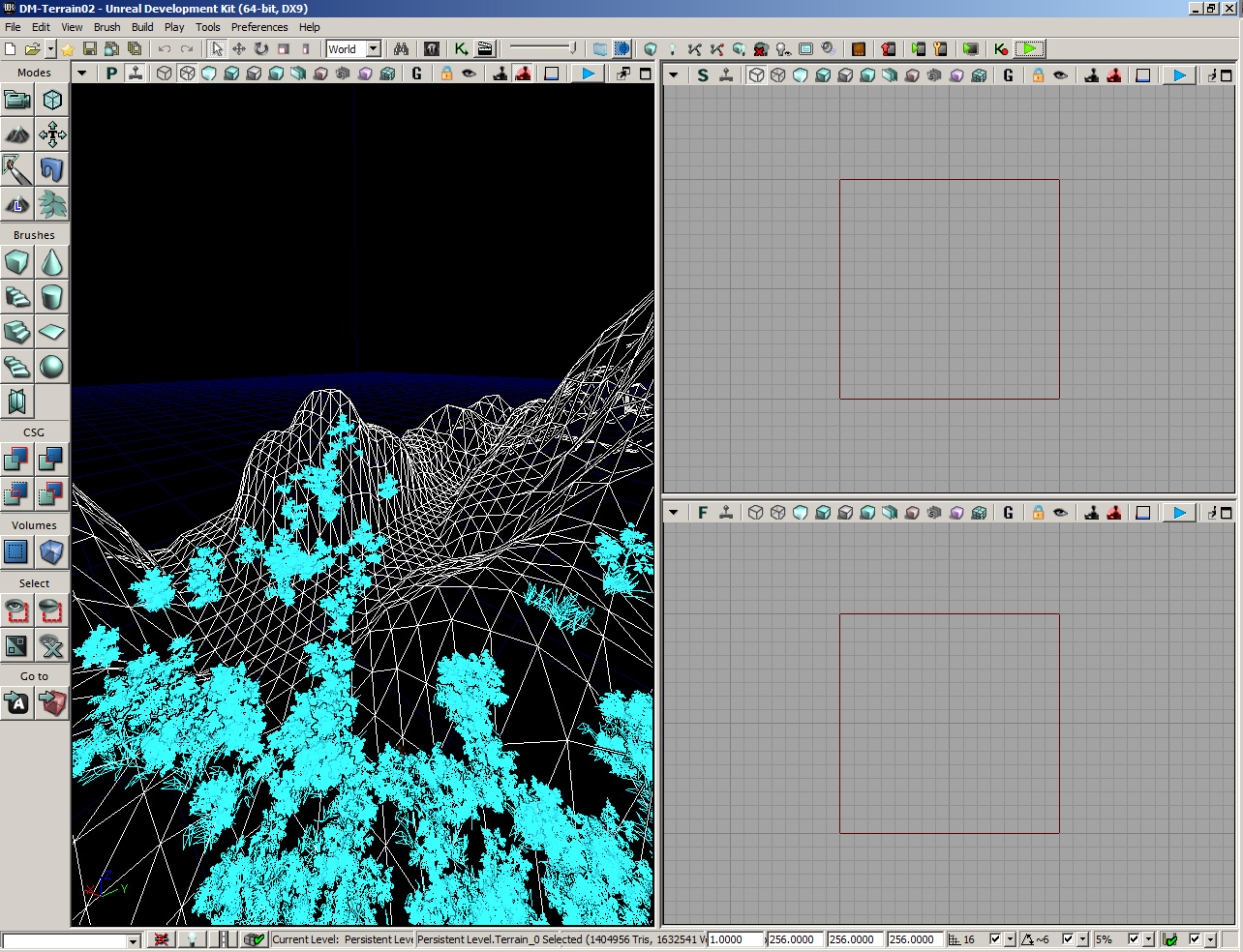 UDK’s tools are pretty incredible to be honest, and using it really hits home how important good tooling is if you want to build rich interactive 3D worlds. Unreal Engine’s terrain editing features make a task that would otherwise be quite time consuming and difficult, relatively easy. I think I spent no more than 30 minutes shaping my terrain before adding some realistic mountain textures, and a scattering of static meshes for foliage. In many ways it feels just like you’re spray painting the decorations onto the landscape.